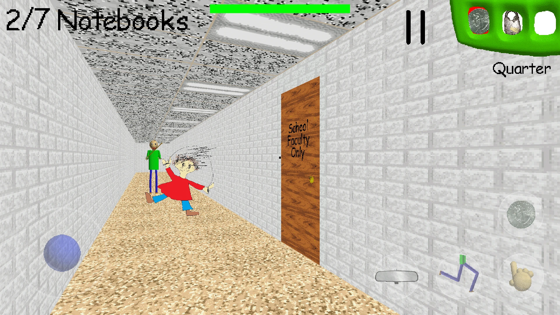 • Step 3: Collect all items and find the exit door before Baldi closes in. Use collected power-ups strategically for temporary boosts or hiding, and restart if caught to track progress.