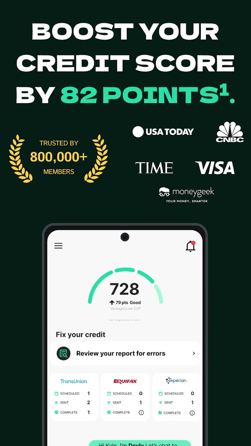 Free access to multiple credit scores and reports. Includes budgeting tools and community forums, but lacks the personalized action plans found in Dovly. |
