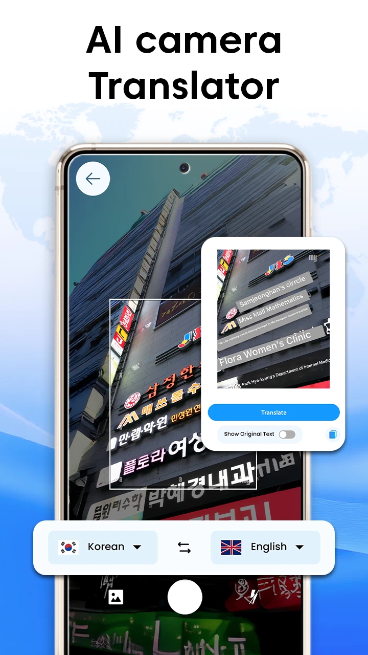 Real-time augmented reality translation using camera to overlay translations directly onto scenes. Includes strong traveler navigation features and local business directory access. |