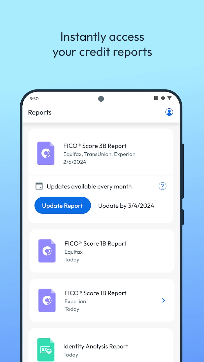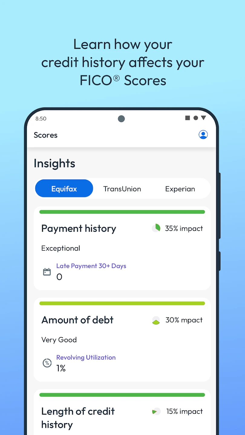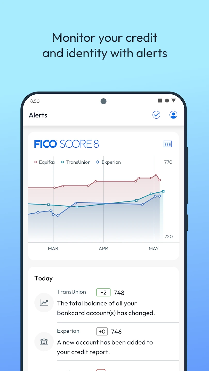 • FICO Score Monitoring: View your FICO credit score and track changes over time with regular updates. This feature helps you stay informed about your financial standing, allowing you to make timely adjustments if your score deviates unexpectedly.