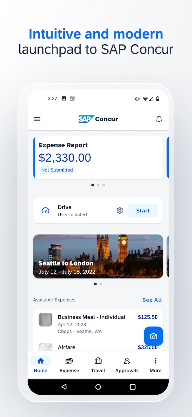 Q: Is there a specific mobile app for using SAP Concur features on a smartphone?