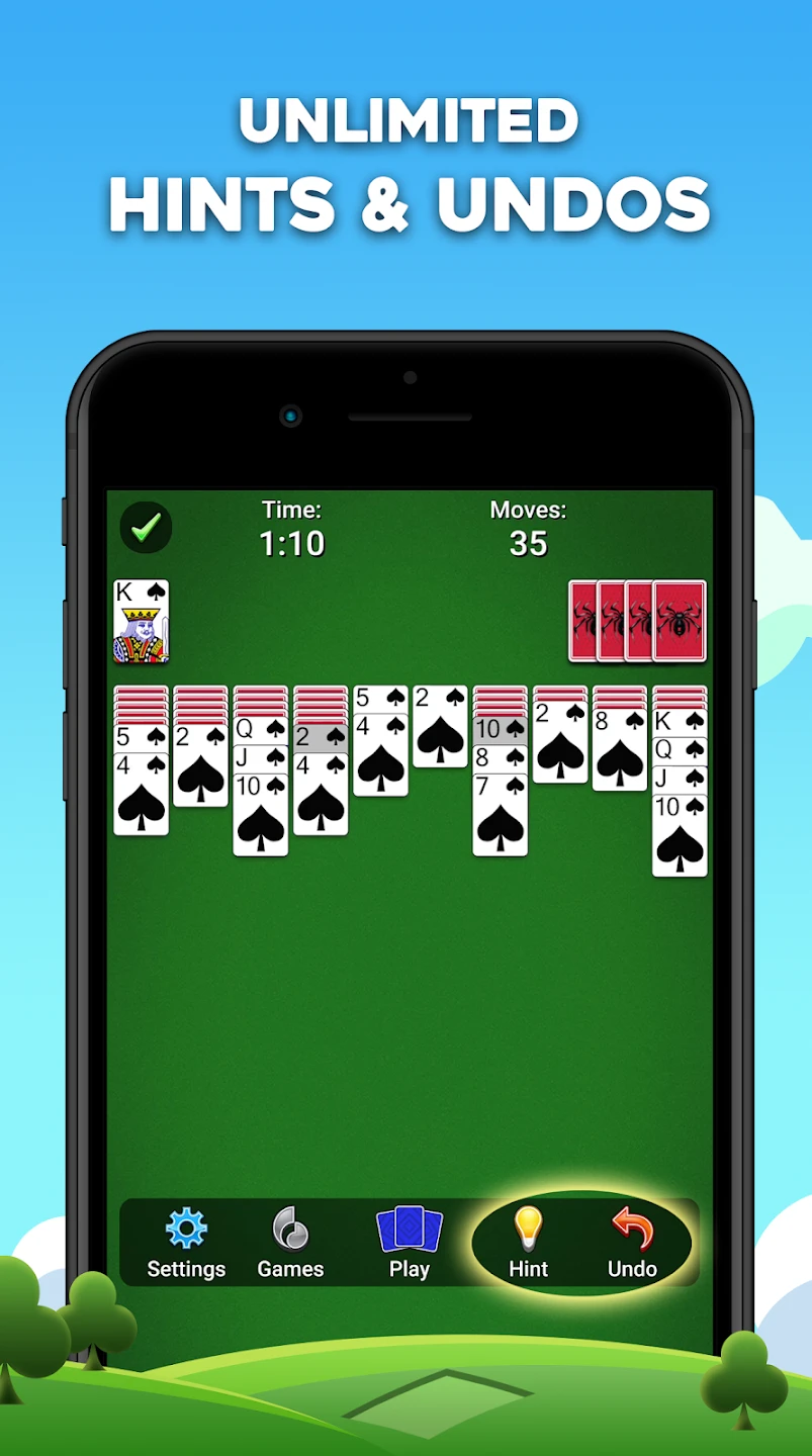 - [Customization or Power-ups]: Standard Spider Solitaire doesn’t heavily feature power-ups, customization options, shops, or progression systems beyond difficulty levels and potentially earned achievements or score leaderboards. Motivation for ongoing play comes from beating higher levels, clearing difficult layouts, achieving speed records, or unlocking potentially cosmetic elements like card back designs.