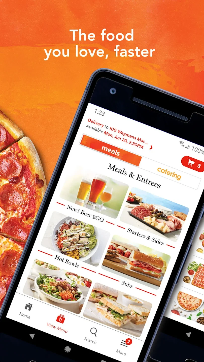 A: The app offers diverse options including rotisserie chicken, pre-made salads, soups, sandwiches, sushi platters, hot deli foods, and weekly themed meal kits. You can also order specific items like Wegman’s Fresh Food Panini or pizza.